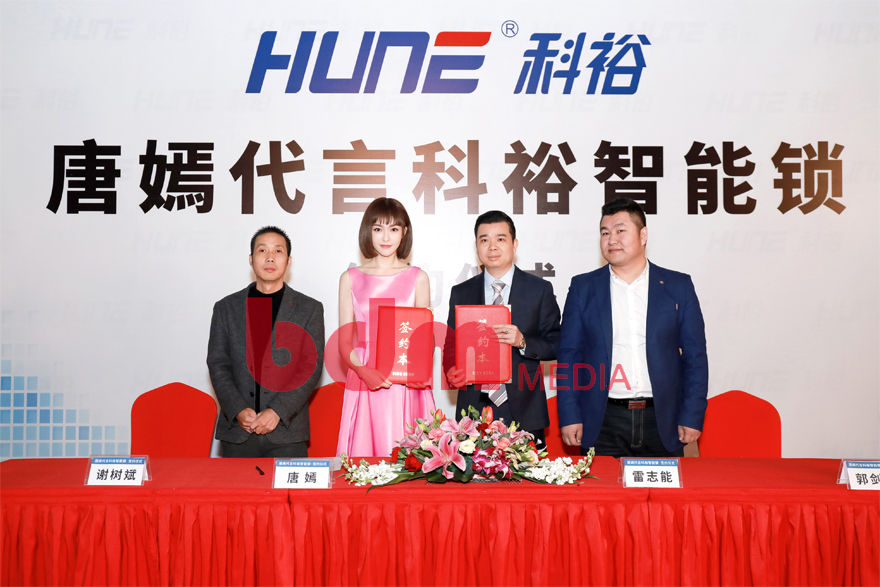 2018年初,北京联动传媒集团携手科裕智能锁与知名影星唐嫣在上海正式举行签约仪式。